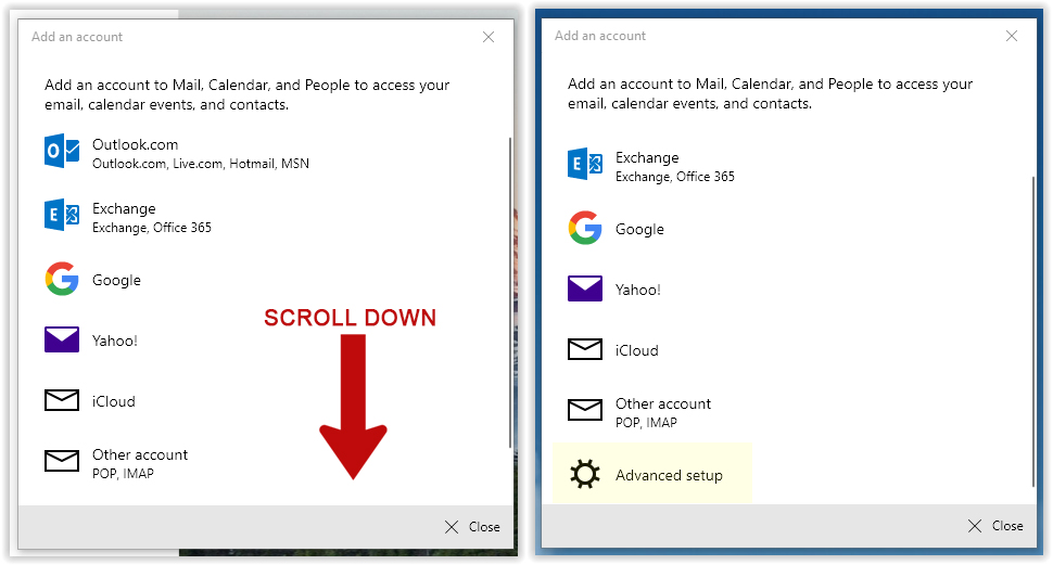 In the Add an Account window that appears, scroll down to the bottom of the list and select Advanced setup. Depending on your device, it may not be obvious that this window has a scroll bar - just hover your mouse cursor over the window and scroll down.